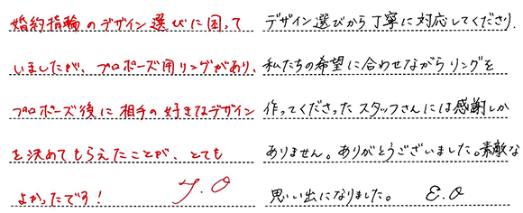 プロポーズプランをご利用いただき、ダイヤと誕生石をあしらったエンゲージリングをお作りしました。