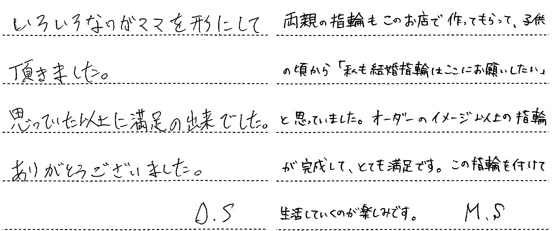 両親の指輪もこのお店で作ってもらって、子供の頃から「私も結婚指輪はここにお願いしたい」と思っていました。オーダーのイメージ以上の指輪が完成して、とても満足です。この指輪を付けて生活していくのが楽しみです。